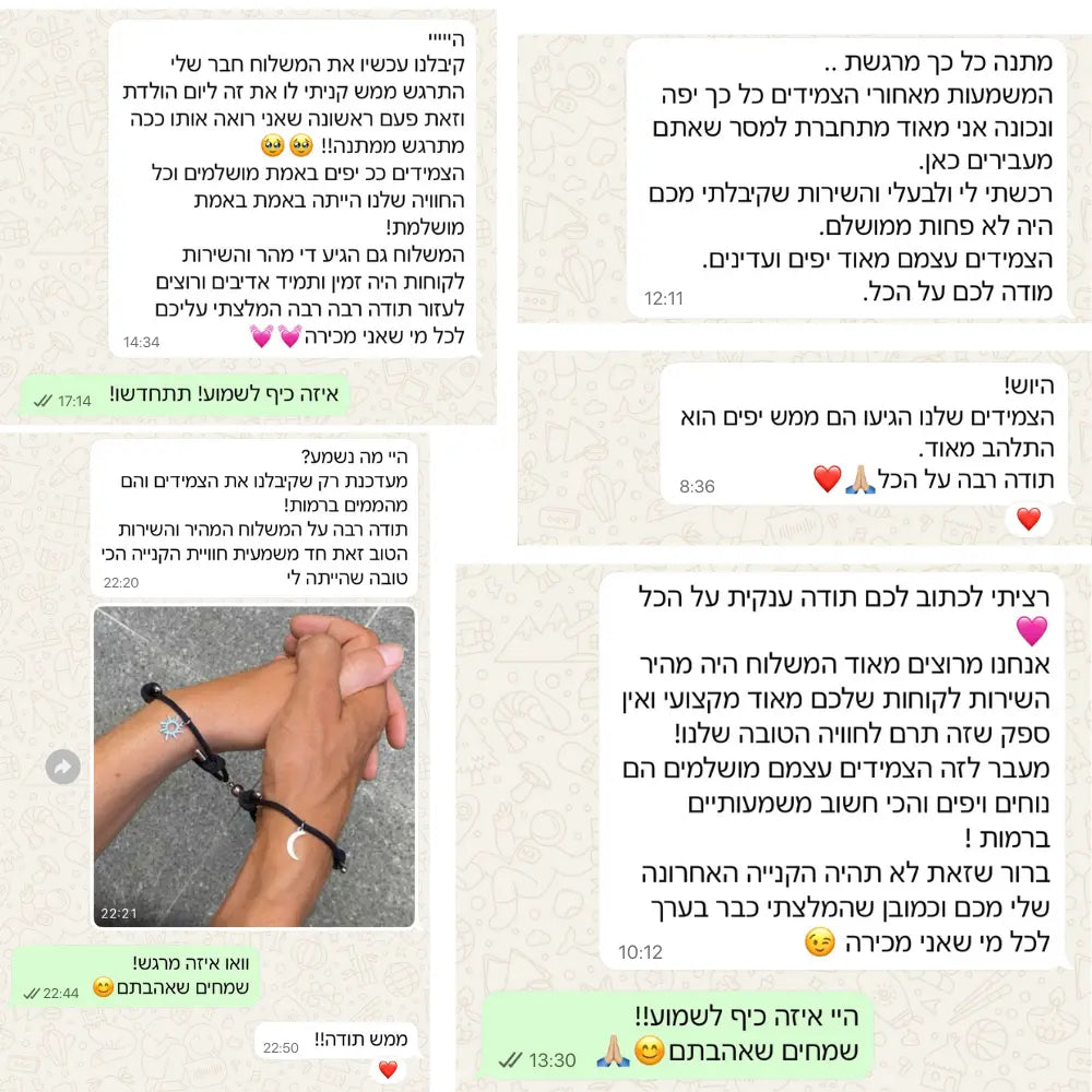 המשלוח הגיע יותר מהר ממה שציפיתי. את האמת בהתחלה הייתי סקפטית לגבי איך זה יגיע אבל הכל היה פשוט מושלם! האריזה הייתה מהממת והצמידים באמת כל כך יפים והמשמעות שלהם מדהימה. ברור שהמלצתי כבר לכל החברות שלי!